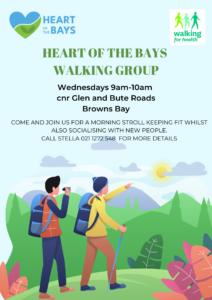 Join us on a walk around Browns Bay each week. The walk will start and finish at Heart of the Bays with tea and coffee provided afterwards. Contact Stella on 021 1272 548 for more details.